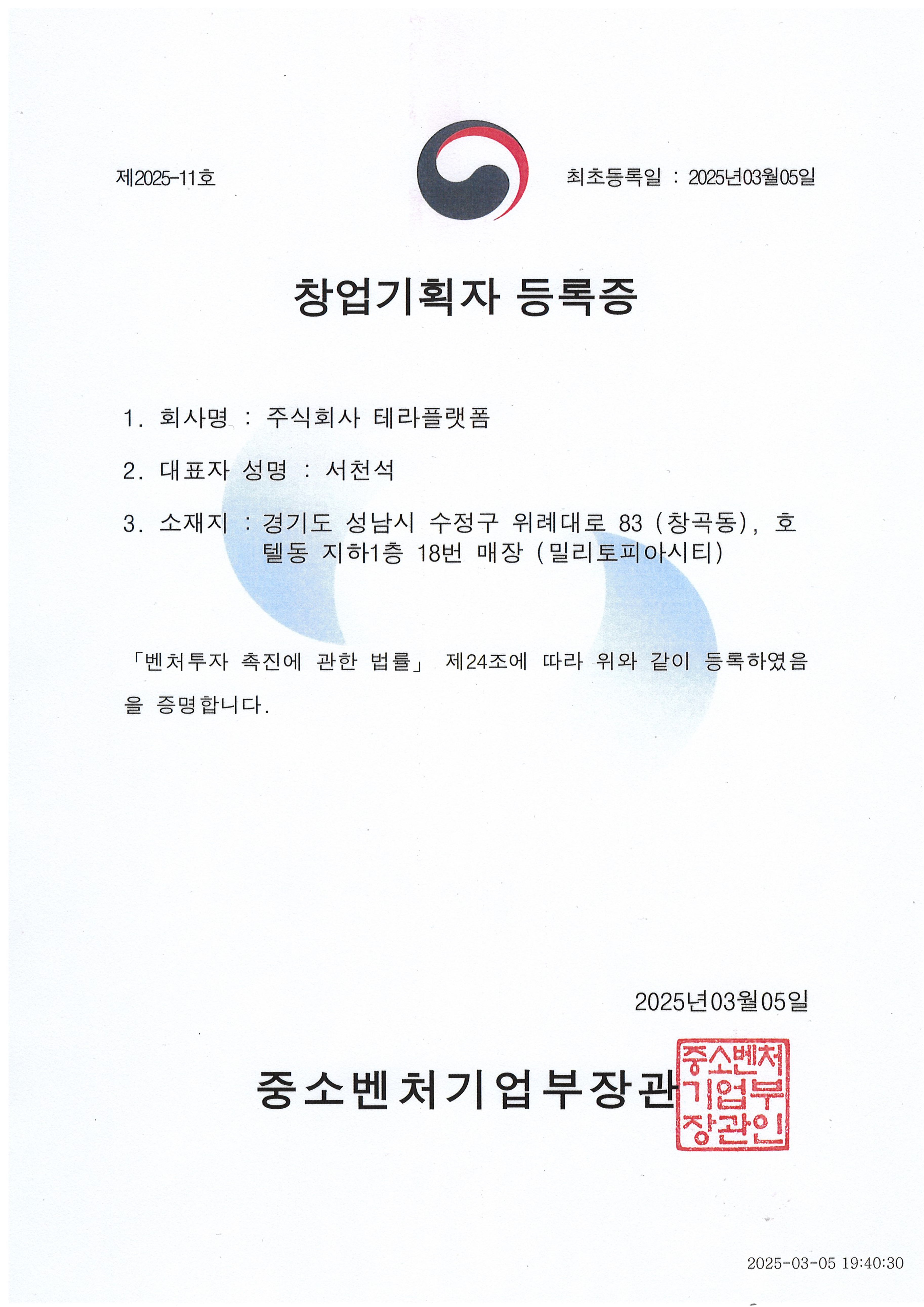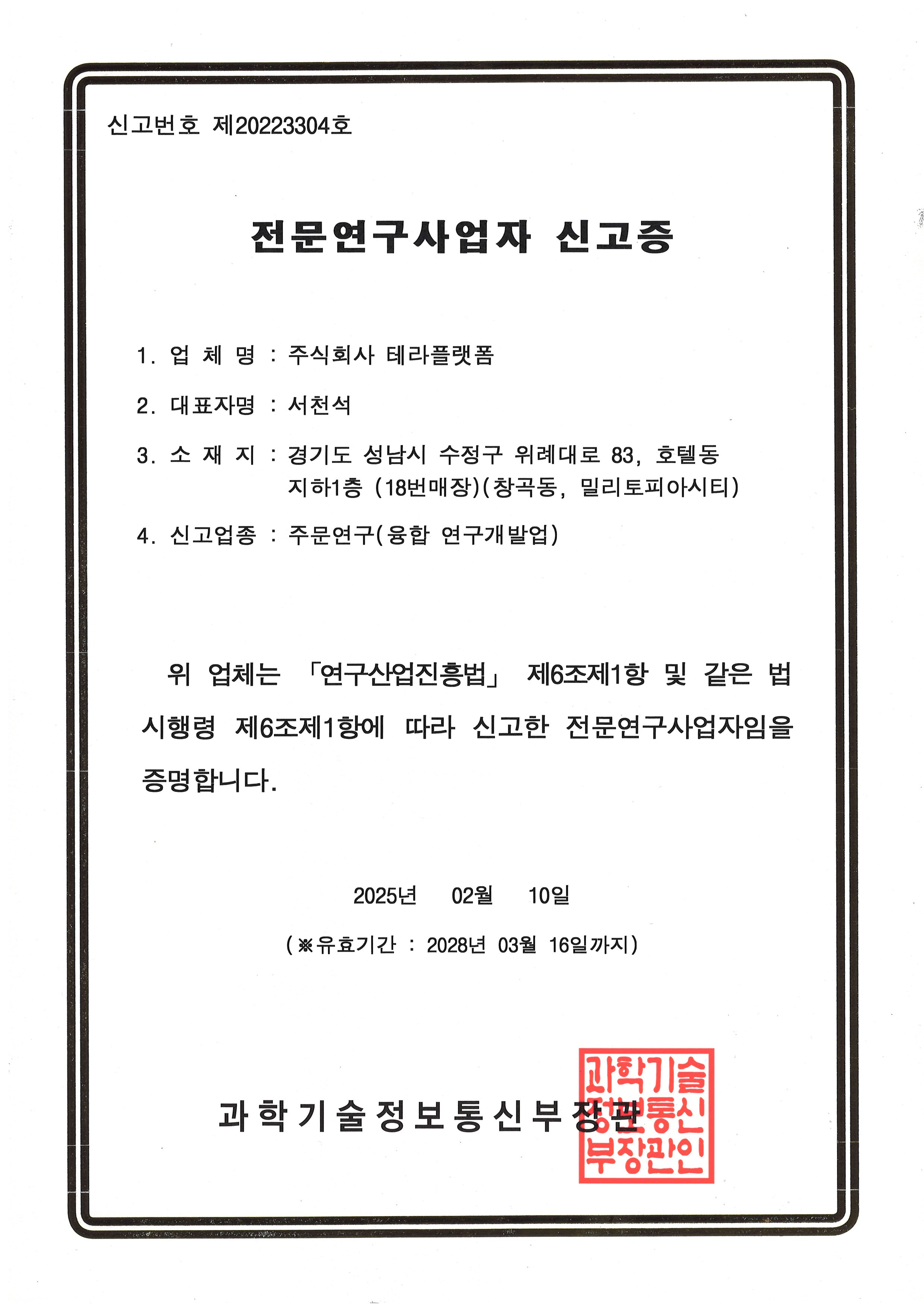테라플랫폼의 인증 및 MOU, 협력사, 특허 출원